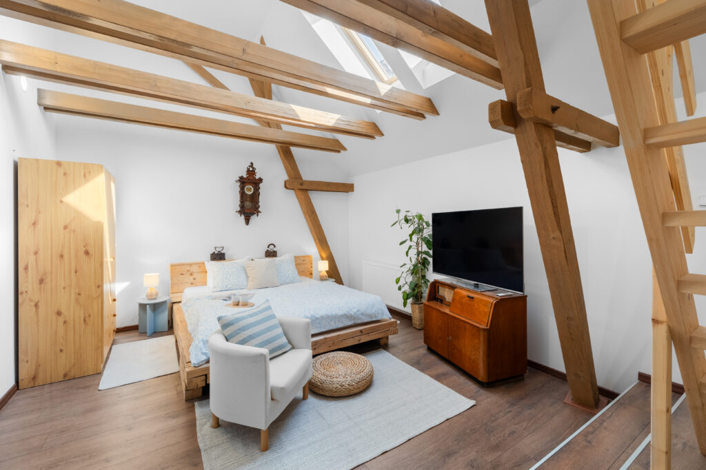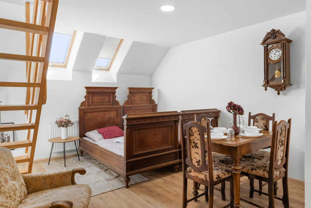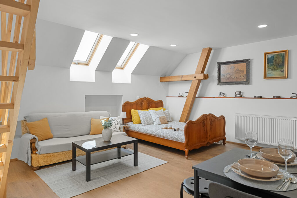 Prostorné podkrovní studio. Ideální pro dvě osoby, z rozloženým gaučem ale i pro čtyři.