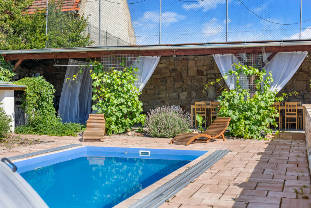 Venkovní prostor s bazénem, posezením, grilem, saunou, ohništěm a sportovním multifunkčním hřištěm.